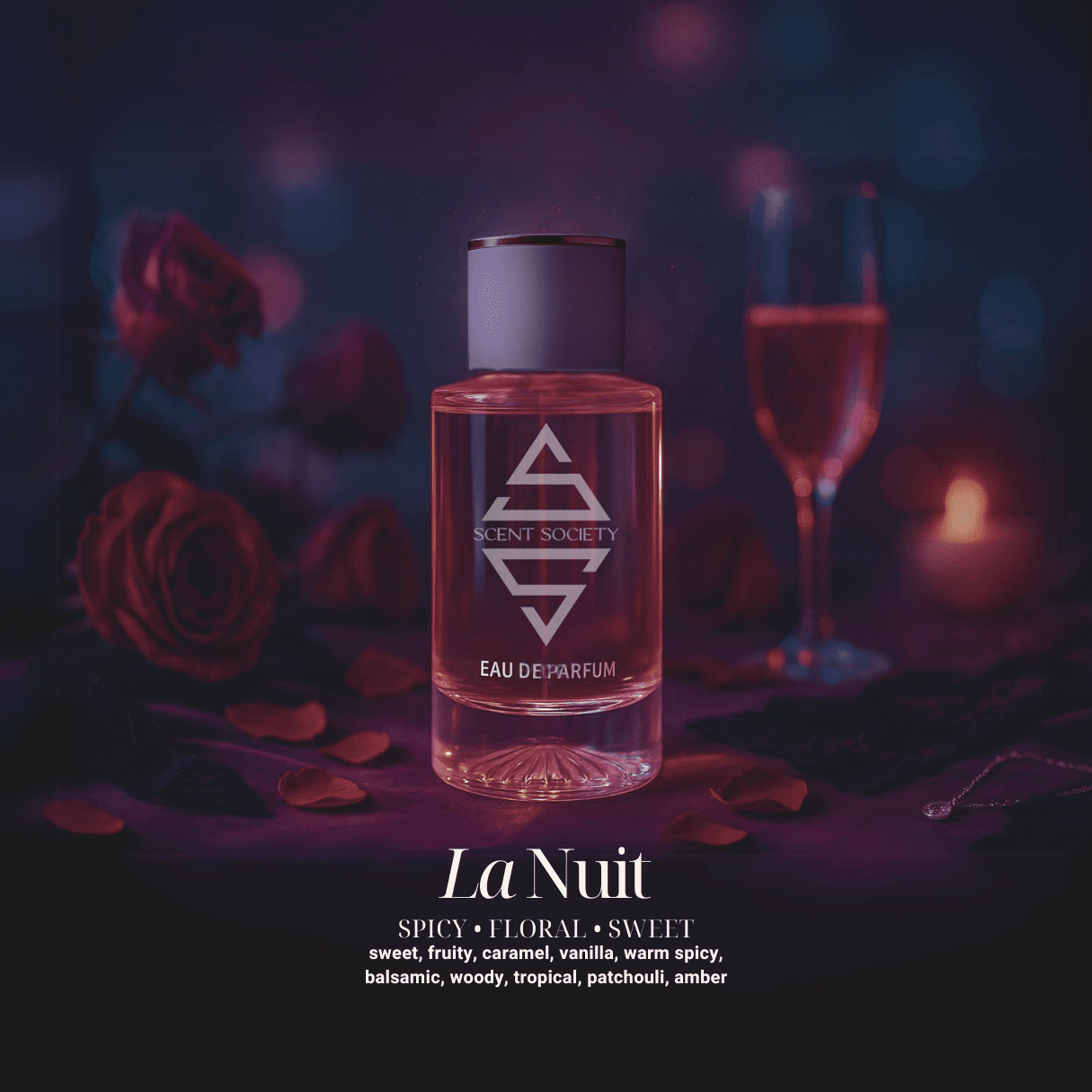 But the real power of La Nuit Perfume lies in its base. A rich fusion of woody patchouli and golden amber anchors the composition, leaving a velvety, balsamic trail that lingers long after the night ends. The patchouli adds a dark, earthy contrast that balances the sweetness, while amber provides a glowing warmth that feels magnetic and seductive. Together, they form a scent that evolves beautifully over time — mysterious, mature, and deeply feminine.